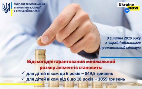 з 1 липня 2019 року в Україні збільшується розмір прожиткового мінімуму на одну особу. Ініційований Міністерством юстиції України закон #ЧужихДітейНеБуває передбачає, що мінімальний розмір аліментів на утримання дитини залежить від прожиткового мінімуму та складає 50% від його розміру.